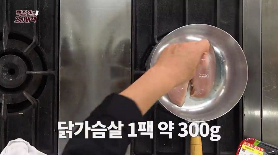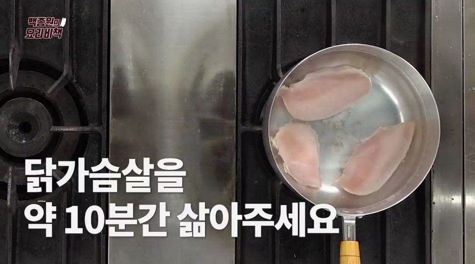 2. 이후 냄비에 물 약 11컵과 닭가슴살 1팩(약300g)을 넣고 약 10분간 삶아주세요. (처음에는 센 불에서 끓이다가 물이 끓어오르면 중불로 낮춰 삶아주세요)