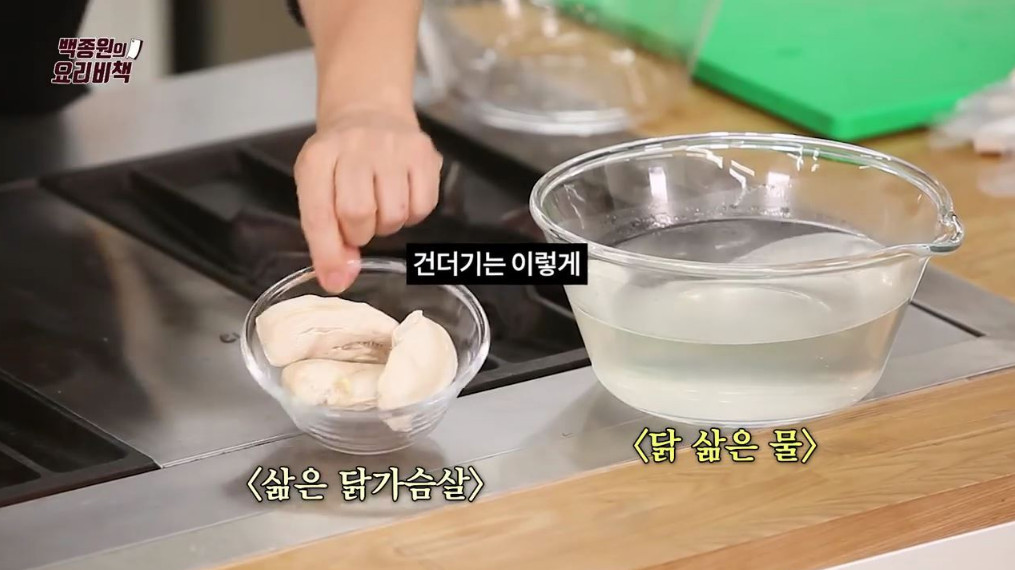 3. 닭가슴살이 익으면 건더기를 건져내어 삶은 닭가슴살과 닭 삶은 육수를 따로 준비해 주세요.