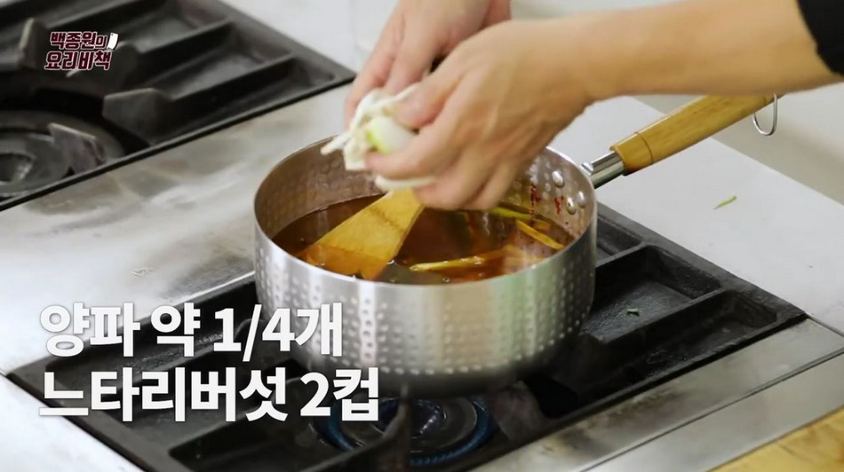 10. 고추기름이 만들어졌으면 아까 닭을 삶았던 육수를 모두 붓고 손질한 느타리버섯, 양파, 닭가슴살과 간 생강 약간, 국간장 1/5컵(40g), 간 마늘 1큰술(20g), 꽃소금 2/3큰술(8g)을 넣고 강불에 끓입니다.