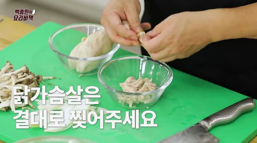 7. 아까 삶아 놓은 닭가슴살이 식었으면 결대로 손으로 찢어주세요. 칼로 썰면 닭가슴살이 으스러질 수 있으므로 손으로 찢는 것이 좋습니다.