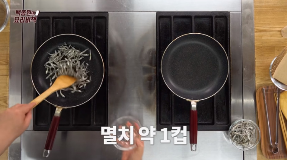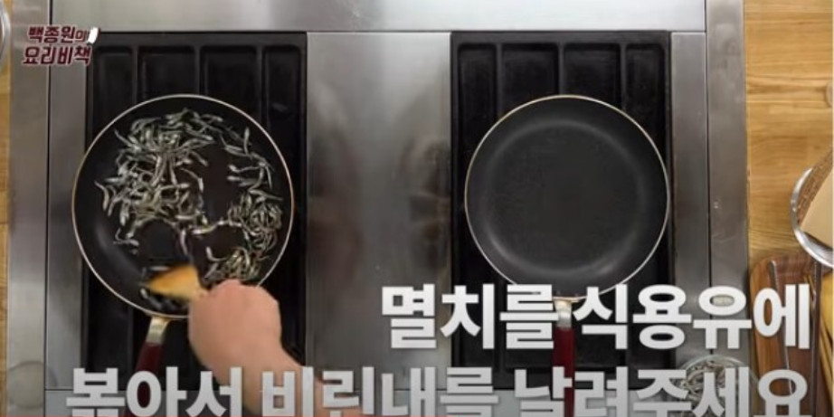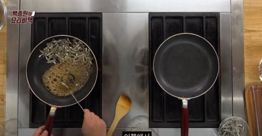3. 달군 프라이팬에 식용유 3큰술을 두른 후 멸치를 넣고 볶아 비린내를 날리는데, 만약 비린내가 싫으신 분들은 미리 마른 프라이팬에 멸치를 한 번 볶아도 괜찮습니다.