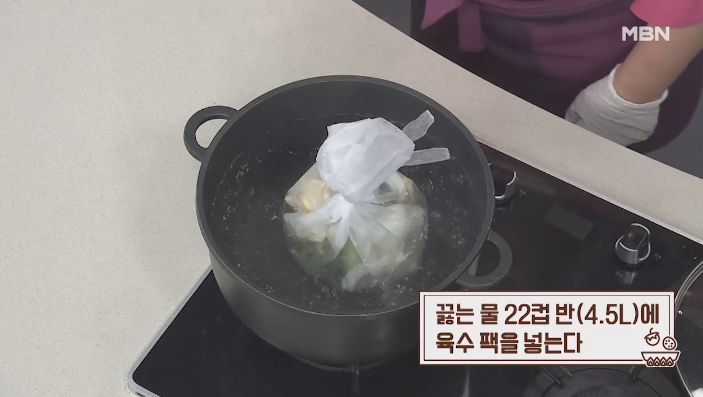 11. 끓는 물 22컵 반(4.5L)에 육수팩을 넣은 후, 삼계탕을 더욱 맛있게 만드는 비법 재료인 껍질을 벗긴 감자 1개를 통째로 넣어 주세요. 삼계탕에 감자를 넣는 것이 조금 생소할 수 있지만, 감자는 육수에 구수함과 단맛을 더하고, 풍미를 한층 업그레이드해준답니다.