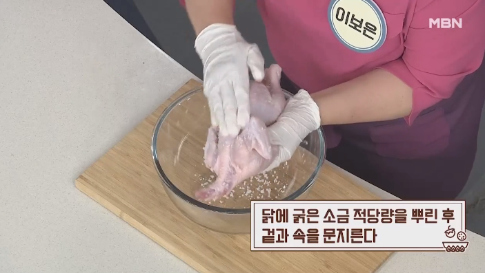 3. 닭에 굵은 소금을 적당히 뿌린 후, 겉과 속을 잘 문질러 주세요. 굵은 소금은 불순물을 흡착해 닭을 깨끗하게 만들어 줍니다.