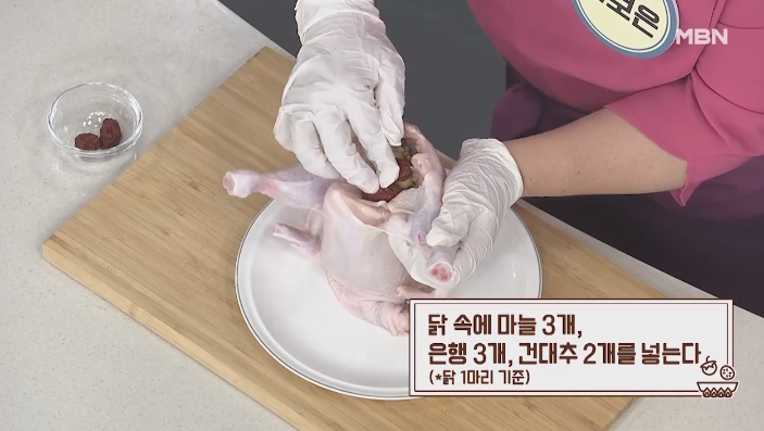 8. 닭 속에 마늘 3개, 은행 3개, 건대추 2개를 넣어 주세요. 이 재료들은 삼계탕의 맛을 풍부하게 해주는 중요한 요소입니다. 마늘은 잡내를 없애고, 건대추는 자연스러운 단맛을 더해주니 꼭 추가해 주세요.