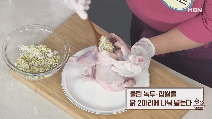 7. 불린 녹두와 찹쌀을 닭 두 마리에 골고루 나누어 넣어 주세요.