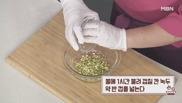 5. 이제 삼계탕의 핵심 재료를 준비할 차례입니다. 먼저, 볼에 1시간 정도 불린 껍질을 벗긴 녹두 약 반 컵을 넣어주세요. 껍질을 벗긴 녹두를 사용하는 이유는 텁텁한 맛이 없어 더욱 깔끔한 맛을 낼 수 있기 때문입니다.
