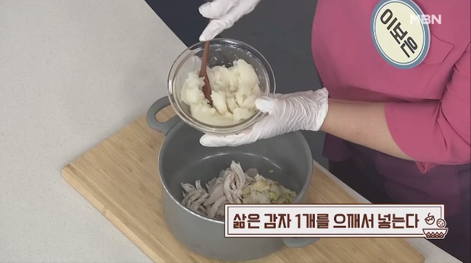 2. 삼계탕에 넣었던 삶은 감자 1개를 잘 으깨어서 넣어주세요.