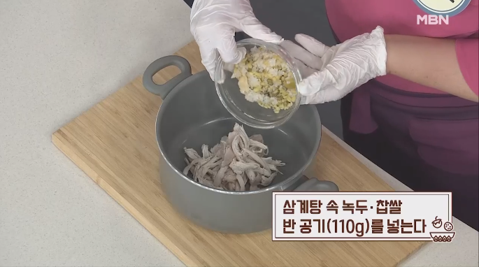 1. 냄비에 먹기 좋게 찢은 삶은 닭고기 100g과 삼계탕 속에 있던 녹두와 찹쌀 약 반 공기(110g)를 넣어주세요.