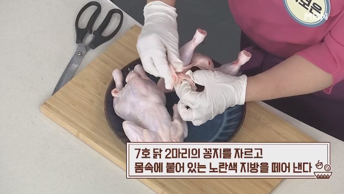 1. 먼저 닭을 손질하는데요, 이번 삼계탕 맛있게 끓이는 황금레시피에서는 7호닭 2마리를 사용할 거예요. 닭의 꼬리 부분을 잘라내고, 몸통에 붙어 있는 노란 지방을 제거해 주세요. 참고로, 7호 닭부터는 목 부분에 지방이 없어서 따로 신경 쓰지 않아도 됩니다. 그러니 꼬리 부분만 손질하면 됩니다.