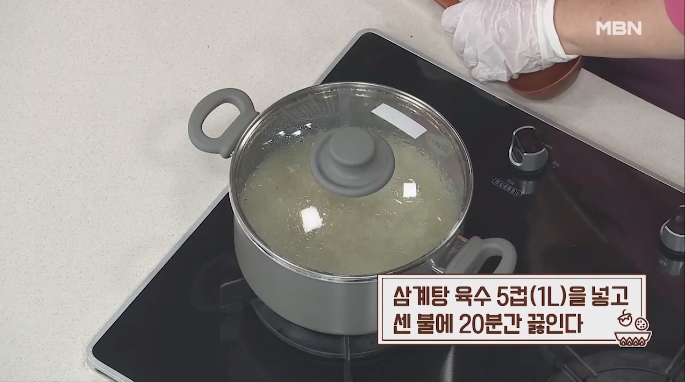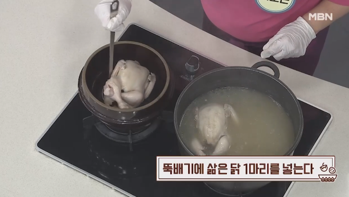 16. 삶은 닭 1마리와 인삼, 육수를 뚝배기에 담아 주세요.