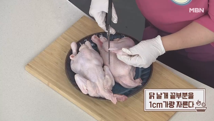 2. 닭 날개는 잡내나 변질을 막기 위해 손질이 필요합니다. 날개 끝부분을 약 1cm 정도 잘라내 주세요.