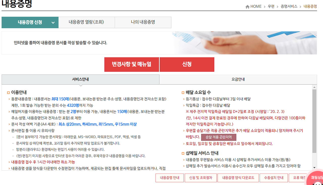 ※ 여기서 '신청' 버튼을 클릭하면 인터넷으로도 내용증명을 발송할 수 있습니다.