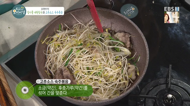 숙주와 부추를 팬에 넣고 센 불에서 약 2분간 빠르게 볶아줍니다. 이때 소금과 후추를 약간 뿌려 간을 맞춰주세요. 숙주는 팬의 잔열로도 익기 때문에 완전히 익히지 않고 살짝만 익혀야 아삭한 식감을 유지할 수 있어요!