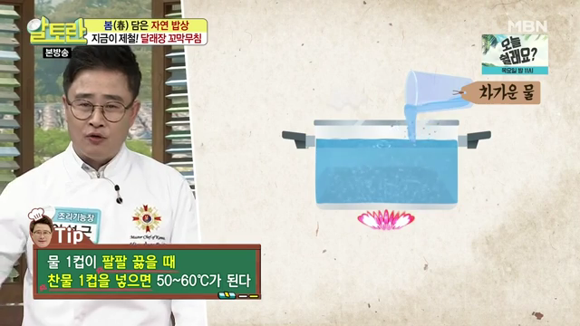 이렇게 계속 한쪽 방향으로 저어주다 보면 물이 끓기 시작하는데, 그때 찬물을 넣어 온도를 낮춰준다고 해요. 꼬막을 삶는 핵심은 물이 끓지 않도록 중탕 온도를 유지하는 거라고 하네요.