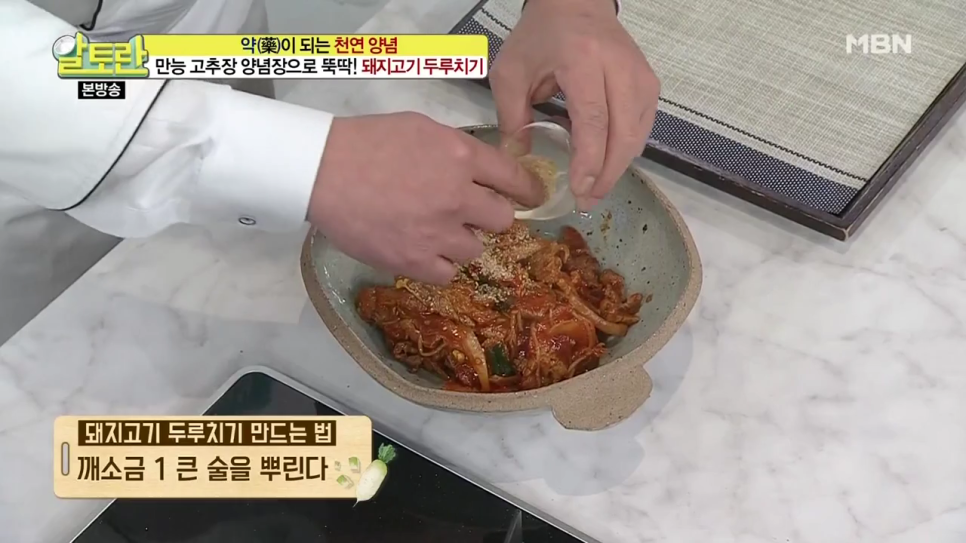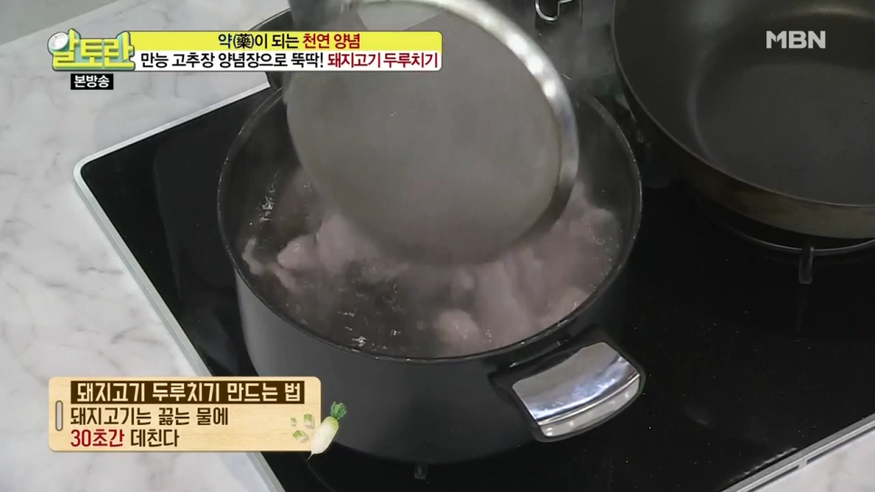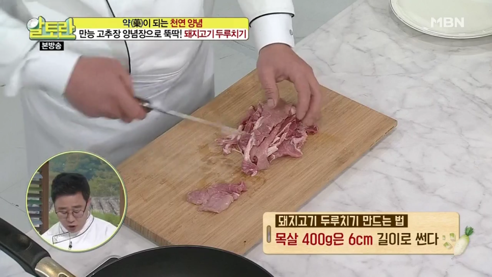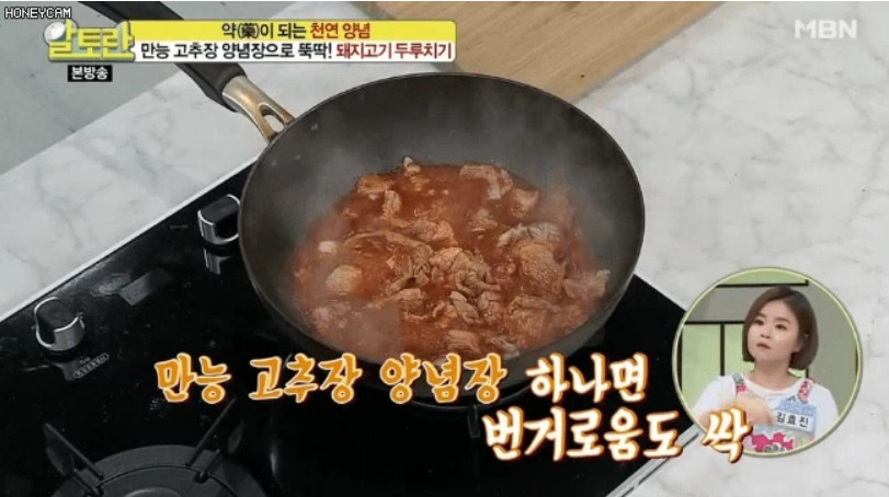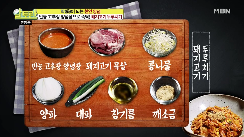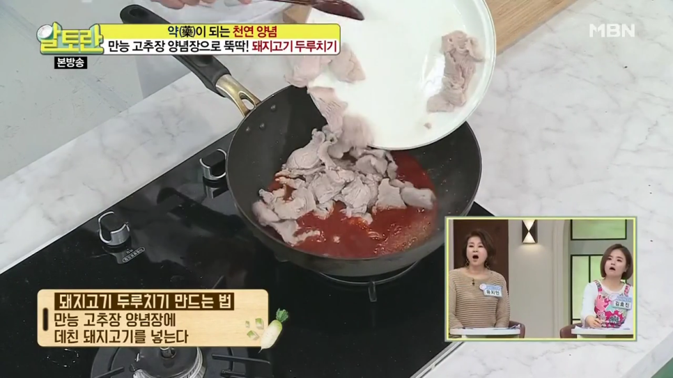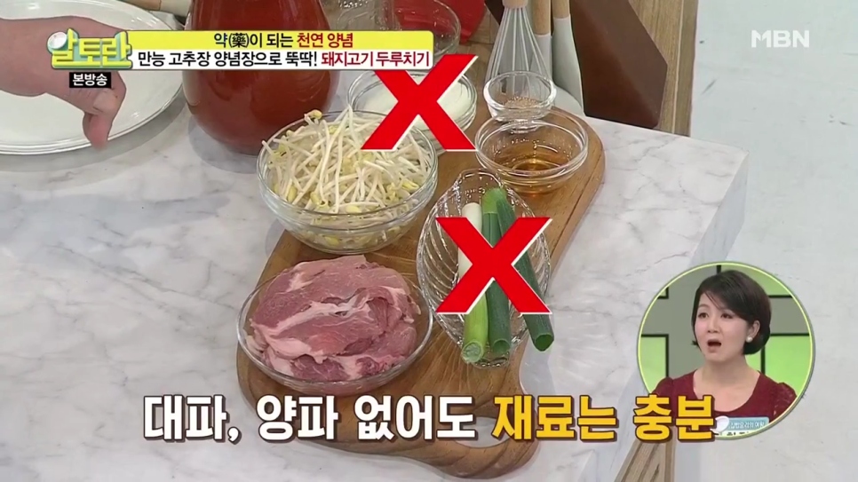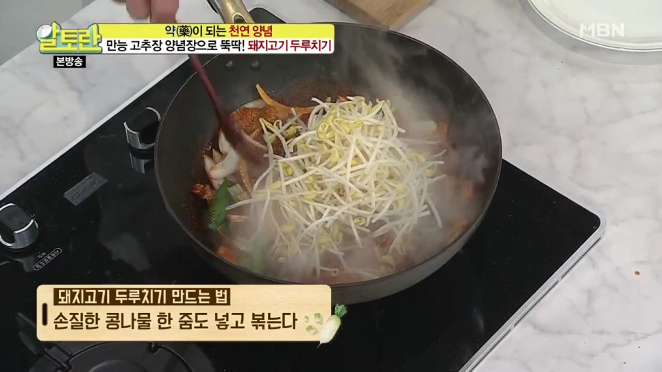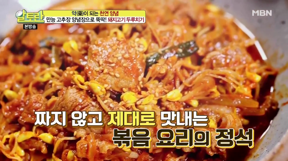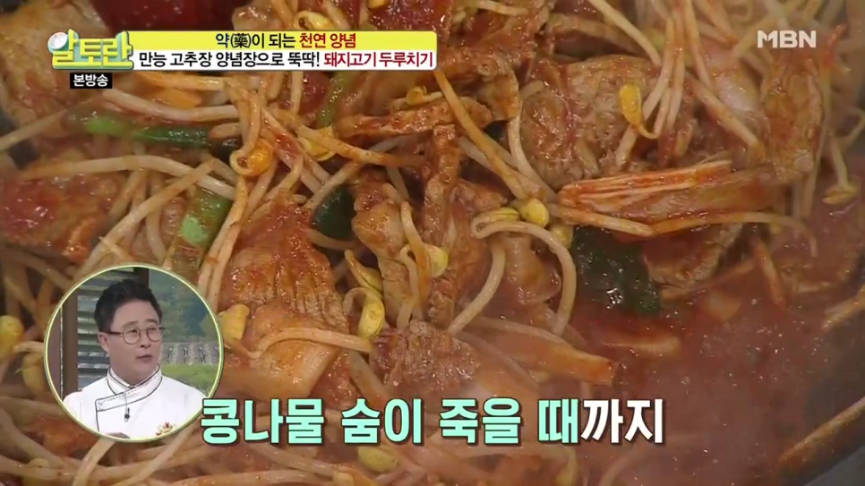만능 고추장 양념장을 활용한 돼지고기 두루치기도 배워봤어요. 콩나물, 양파, 대파 등이 들어가지만 고기만 있어도 매콤하고 맛있다고 하네요.