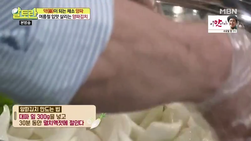 양파잎과 맛과 효능이 비슷한 대파잎 300g을 함께 넣고 잘 섞은 뒤, 30분 동안 멸치액젓에 절여줍니다.