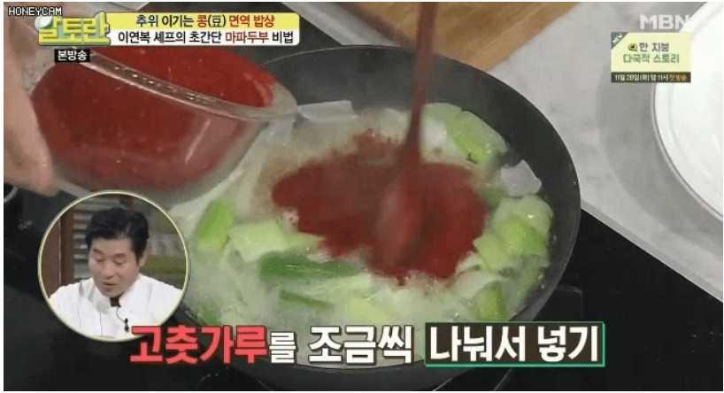 지글지글 끓으며 파 향이 올라오면, 굵은 고춧가루 150g을 조금씩 나누어 넣어주세요.