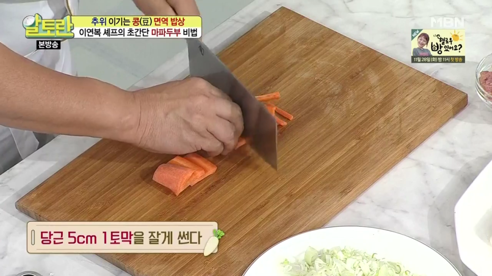 연두부 (2판), 간돼지고기등심(100g), 대파 (2대), 마늘(6알), 당근 (5cm 1토막), 완두콩 (30알), 연근 (1토막)