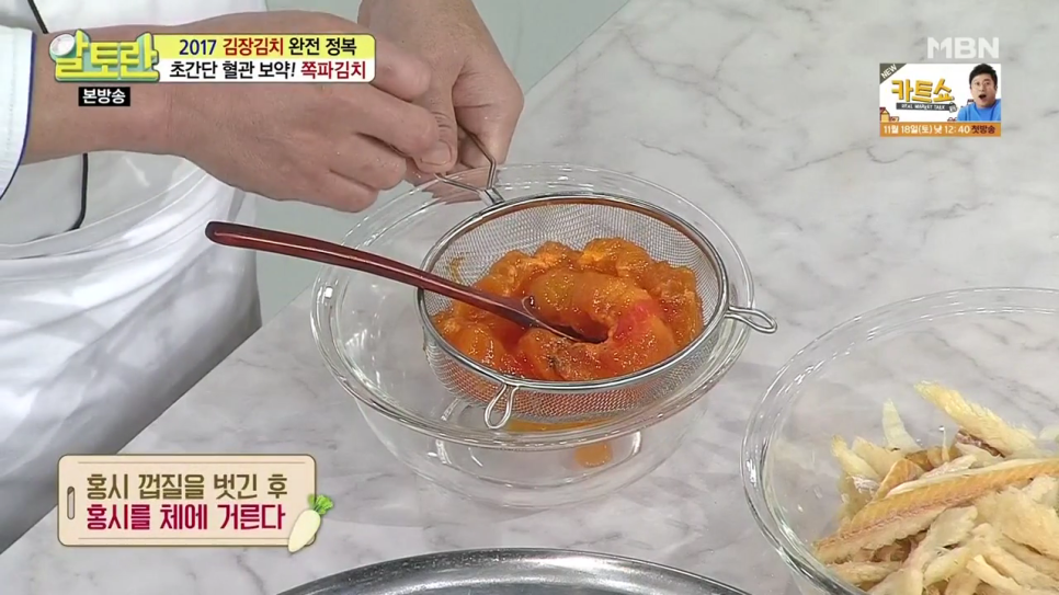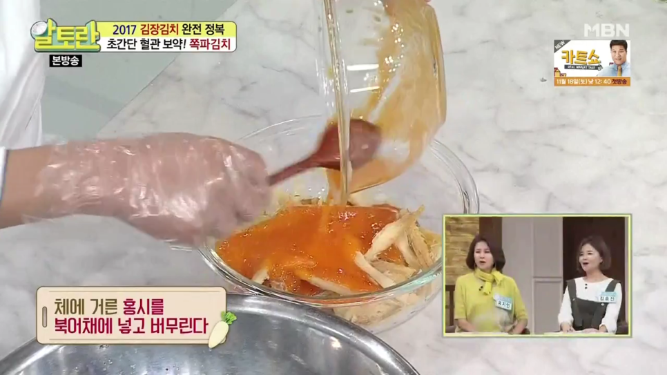 체에 거른 홍시는 북어채와 함께 버무린 뒤, 파김치 양념에 넣어줍니다.