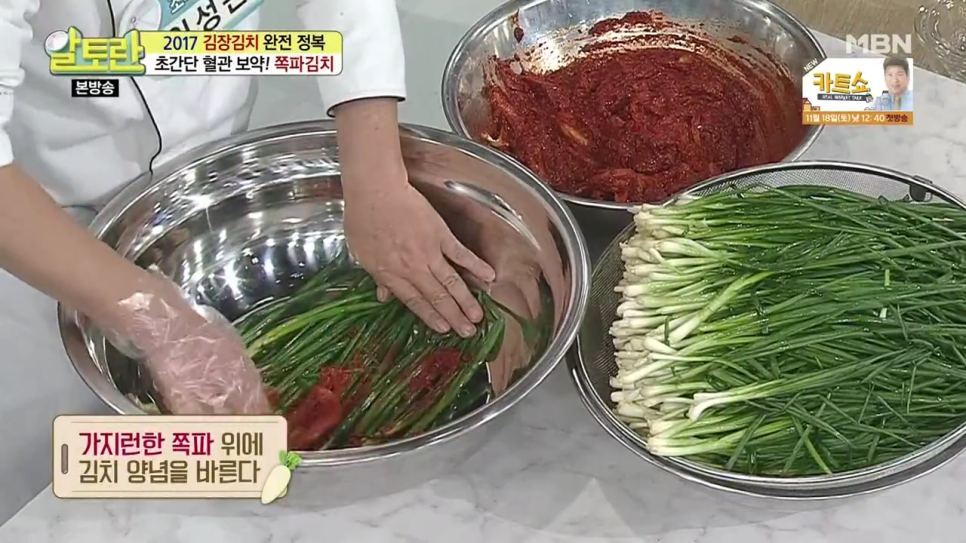 큰 대야에 쪽파 한 줌을 가지런히 펼친 뒤, 만들어둔 김치 양념을 골고루 발라줍니다.