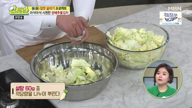 특이하게도 알토란표 양배추물김치는 소금물 대신, 소금과 설탕을 함께 넣고 절인답니다.