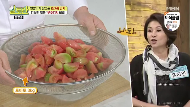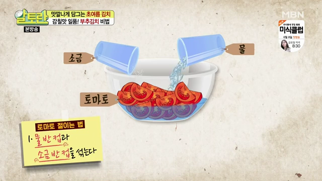 토마토는 물 반 컵과 소금 반 컵을 섞은 소금물에 15분에서 20분 정도 절려주세요. 절인 후에는 물로 씻지 말고 체에 받쳐서 수분만 빼줍니다. 이렇게 소금물에 절이면 토마토의 당도가 높아지고, 더 단단해져서 씹는 식감이 좋아진다고 해요.