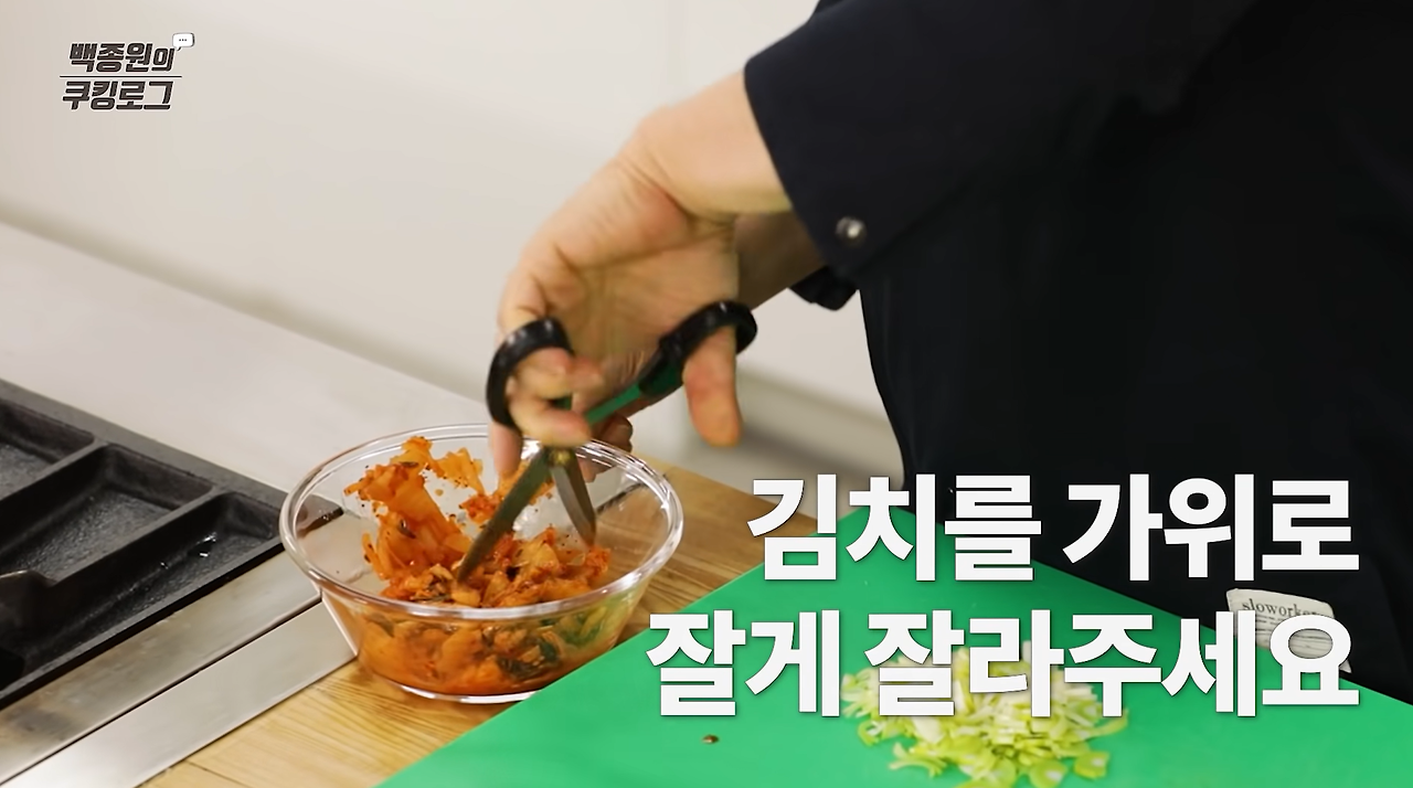 2. 김치는 가위를 사용해 잘게 썰어 준비해 주세요. 김치볶음밥의 맛을 좌우하는 핵심 재료는 바로 김치인데요, 반드시 신김치를 사용해야 더욱 맛있다는 점을 잊지 마세요!
