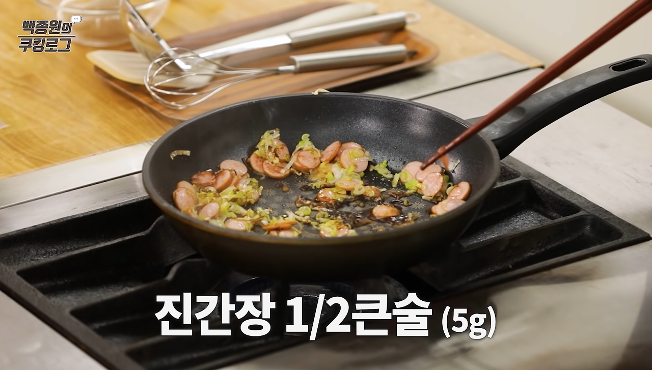 3. 팬에 식용유를 두르고 대파와 소시지를 넣어 노릇노릇하게 볶아 주세요. 소시지는 집에 있는 햄, 소시지, 베이컨 등 무엇을 사용하셔도 괜찮습니다.