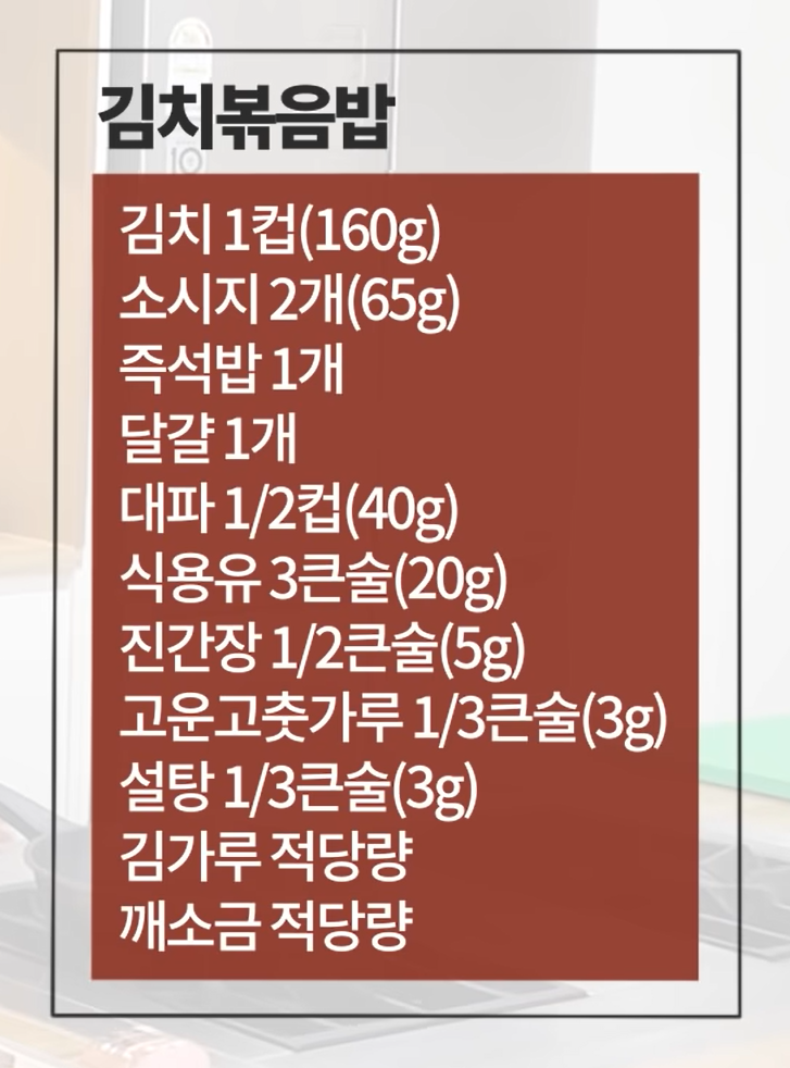 김치 1컵(160g), 소시지 2개(65g), 대파 1/2컵(40g), 식용유 3큰술(20g), 진간장 1/2큰술(5g), 고운고춧가루 1/3큰술(3g), 설탕 1/3큰술(3g), 즉석밥 1개, 달걀 1개, 김가루 적당량, 깨소금 적당량
