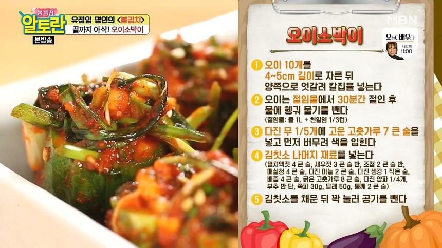 소를 모두 채운 후 밀폐 용기에 넣어 냉장고에 보관하시면, 오이소박이가 맛있게 담그는 방법이 완성됩니다. 지금까지 유정임 황금레시피를 통해 오이소박이 담그는 법을 알려드렸는데요, 익히지 않은 오이소박이를 좋아하시면 바로 냉장고에 보관하시면 되고, 익힌 오이소박이를 원하시면 3~6시간 정도 숙성한 후 냉장고에 보관하시면 된답니다. 참고하세요!