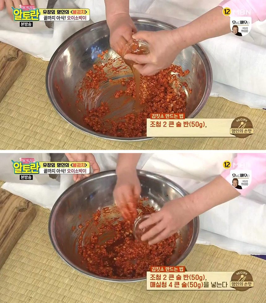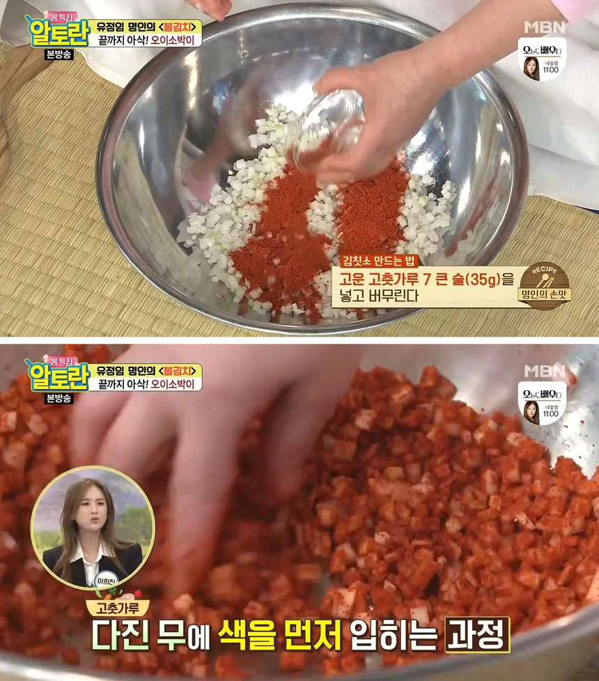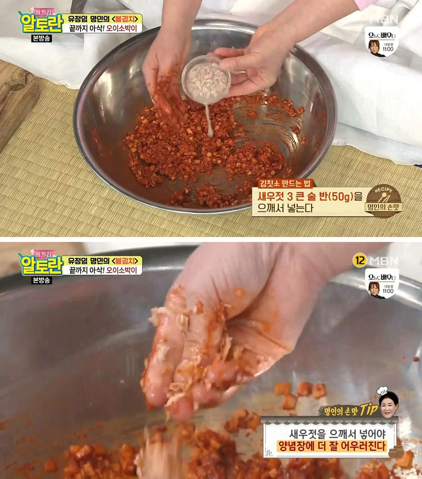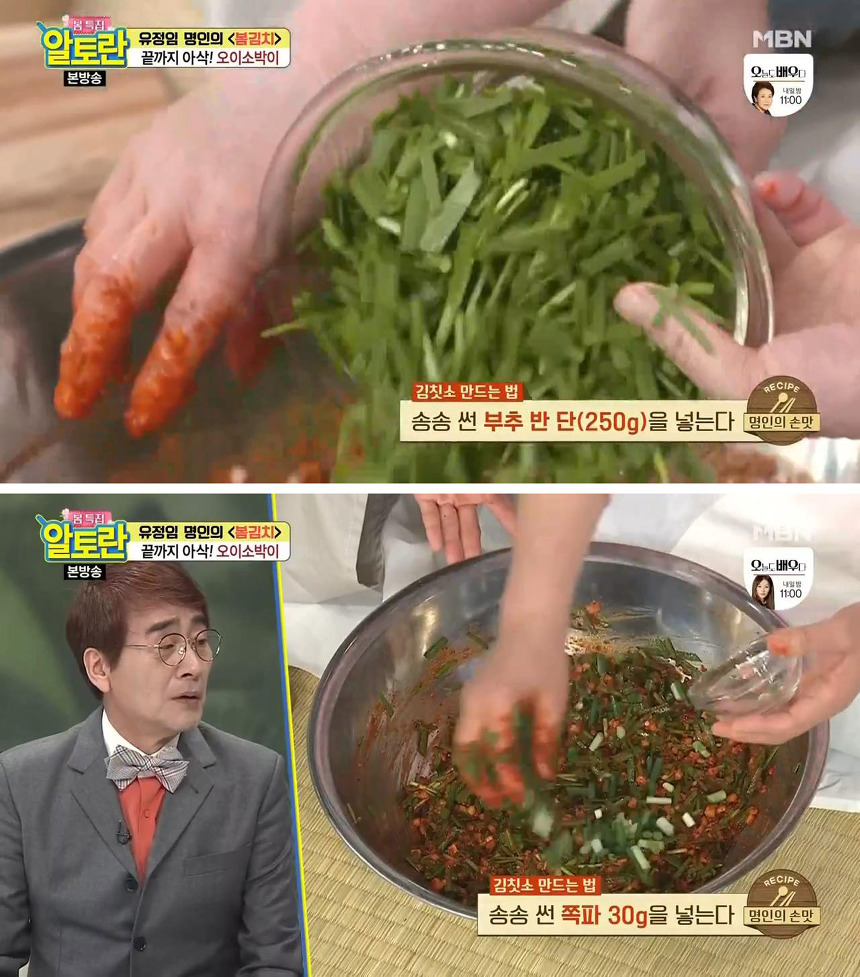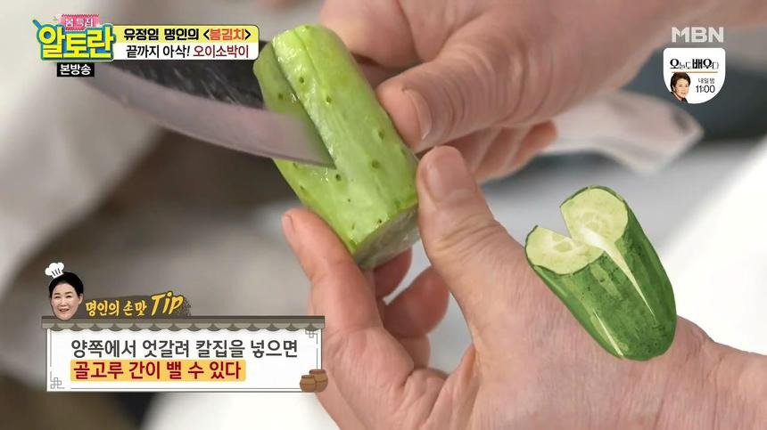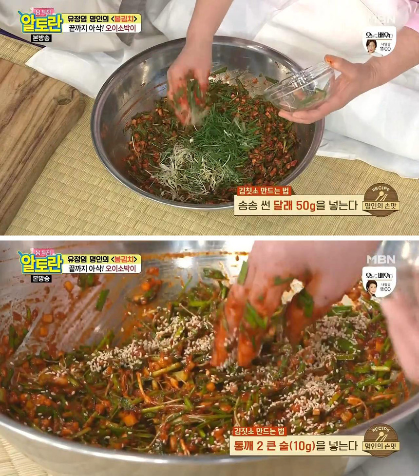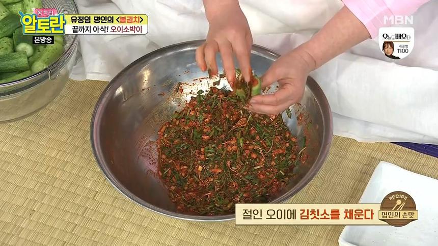 오이소박이를 맛있게 담그는 두 번째 팁은 부추를 양념이 완성된 후에 넣는 것입니다. 이렇게 살짝 버무리면 부추의 풋내가 나지 않아서 더 맛있게 즐길 수 있다고 해요.