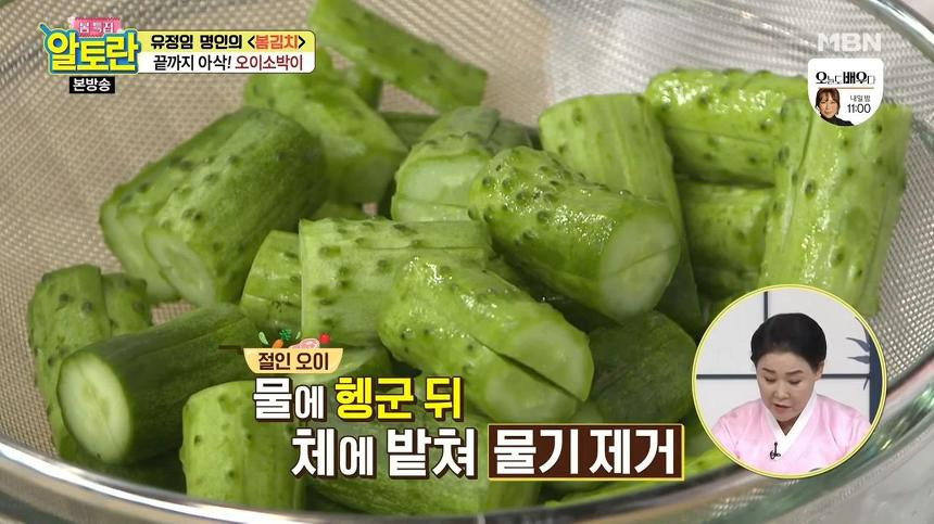4. 오이가 다 절여지면 꺼내서 찬물에 가볍게 헹군 후, 체에 밭쳐 물기를 제거해 주세요.