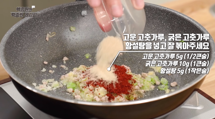 6. 고춧가루와 황설탕을 넣고 잘 볶아주세요. 만약 밖에서 먹는 순두부찌개의 맛을 원하신다면, 고운 고춧가루를 사용하는 것이 좋다고 합니다. 하지만 고운 고춧가루가 없으시면 굵은 고춧가루를 사용하셔도 크게 문제는 없다고 하니 참고하세요.
