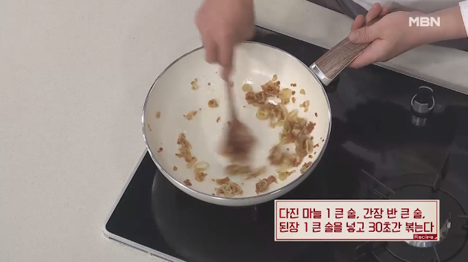 된장 한 큰 술을 넣고 볶아주시면, 이렇게 볶은 된장이 떫은 맛을 없애줘서 훨씬 더 맛있습니다.