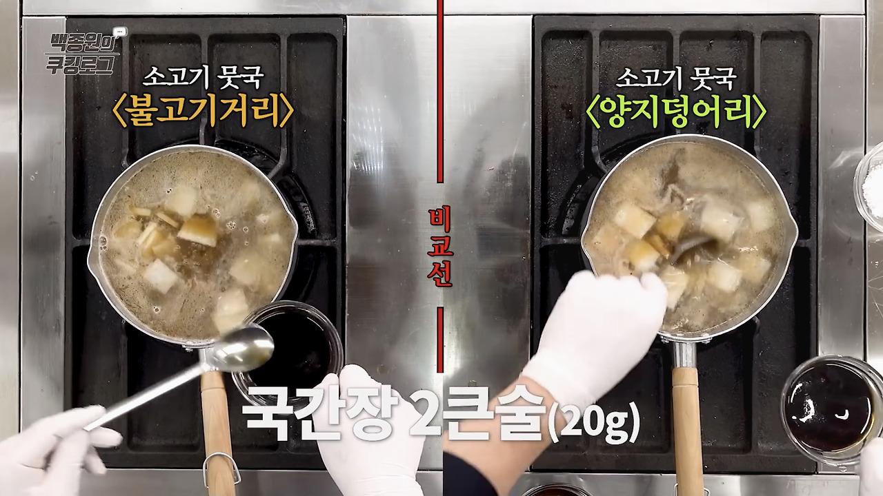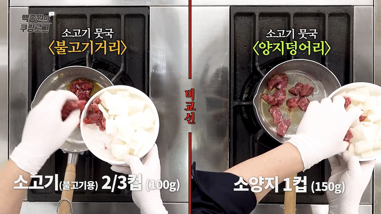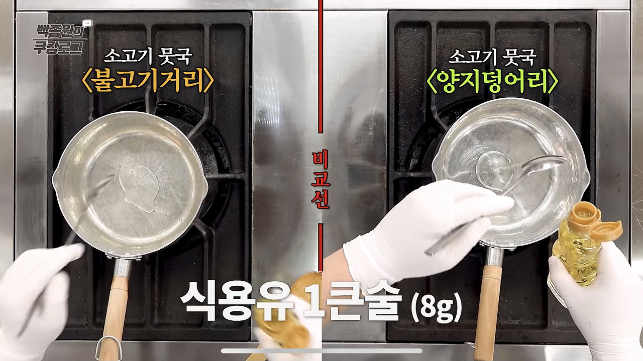4. 냄비에 참기름과 식용유를 넣고 소고기를 넣어 볶아주세요. 백종원 선생님께서는 소고기 불고기용 고기와 양지 두 가지 버전으로 만드는 방법을 보여주셨으니 참고하시기 바랍니다.