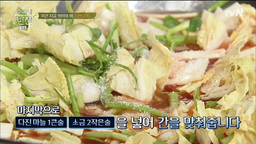 8. 마지막으로 다진 마늘 1큰술과 소금 2작은술을 넣고, 취향에 맞게 간을 맞추면 김수미 선생님의 나박물김치 황금레시피가 완성됩니다.