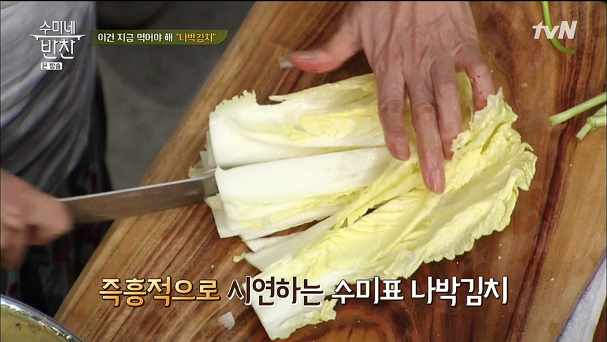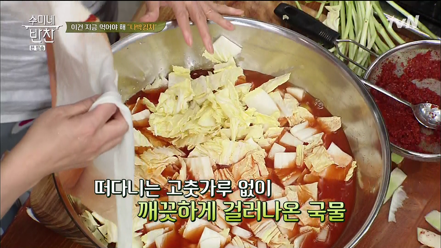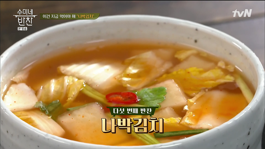 나박김치는 배추와 무를 주재료로 한 국물김치로, 신선한 맛이 중요한데요. 그래서 예전에는 살림이 넉넉한 가정에서는 하루가 멀다 하고 한 번씩 담갔다고 합니다. 나박김치가 없는 밥상은 뭔가 아쉬운 밥상으로 여겨졌다고 하네요. 이제 나박김치에 관한 재미있는 이야기를 들으시고, 김수미 선생님의 나박물김치 황금레시피를 순서대로 살펴보겠습니다.