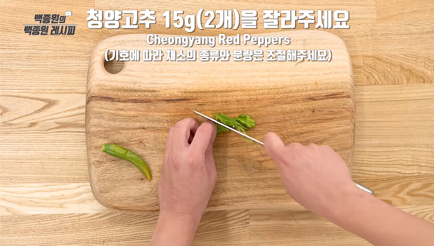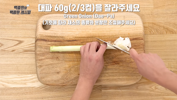 1. 먼저, 재료를 손질해야 하는데요. 대파 60g(약 2/3컵)을 적당한 크기로 썰어주세요. 채소를 자를 때는 같은 방향과 같은 길이로 써는 것이 더욱 깔끔하고 좋습니다.