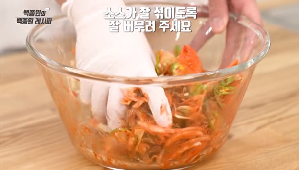 7. 양념이 고루 섞이도록 조심스럽게 버무려 주세요. 너무 세게 섞지 말고, 부드럽게 살살 비벼 주시면 됩니다.