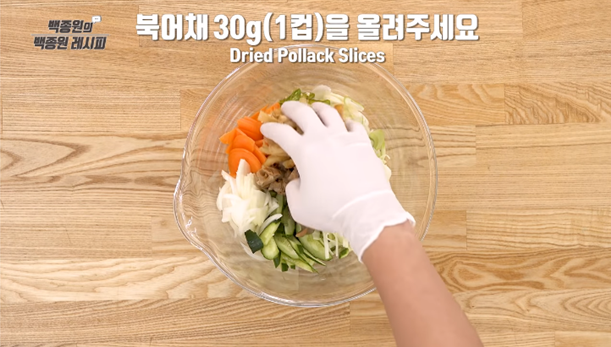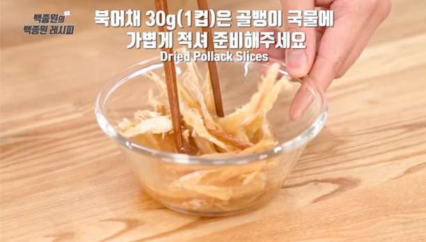 4. 북어채 30g(약 1컵)은 골뱅이 국물에 살짝 적셔서 준비해 주세요.