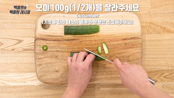 2. 오이 100g(반 개), 양배추 60g(약 2/3컵), 양파 100g(반 개), 청양고추 15g(두 개), 당근 50g(약 1/6개)도 동일한 방식으로 썰어주세요.
