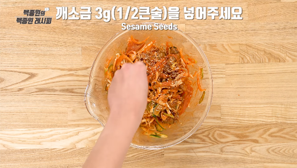 8. 참기름 1큰술과 깨소금 1/2큰술을 넣고 잘 섞은 후, 접시에 담아주면 골뱅이무침 황금레시피, 백종원 선생님의 골뱅이무침 양념장이 완성됩니다.