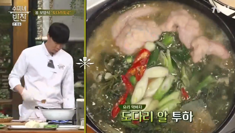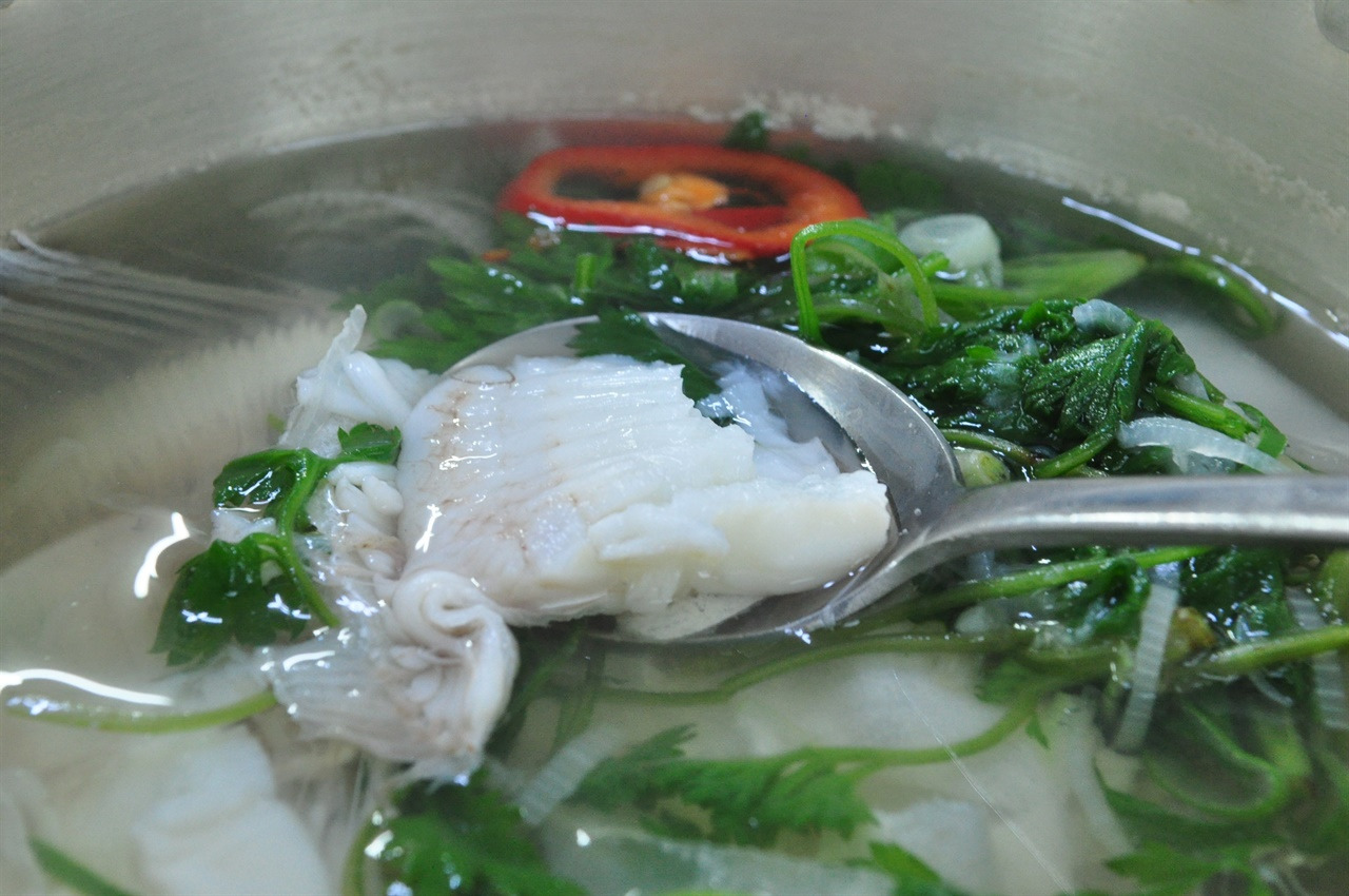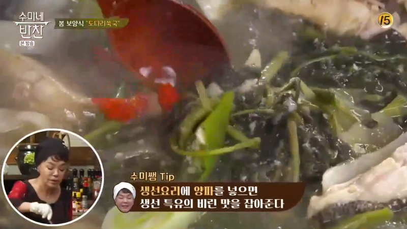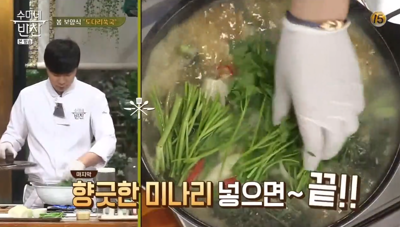 ▶ 도다리가 어느 정도 익으면 미나리를 넣어 주세요. 이렇게 하면 도다리쑥국이 완성됩니다.