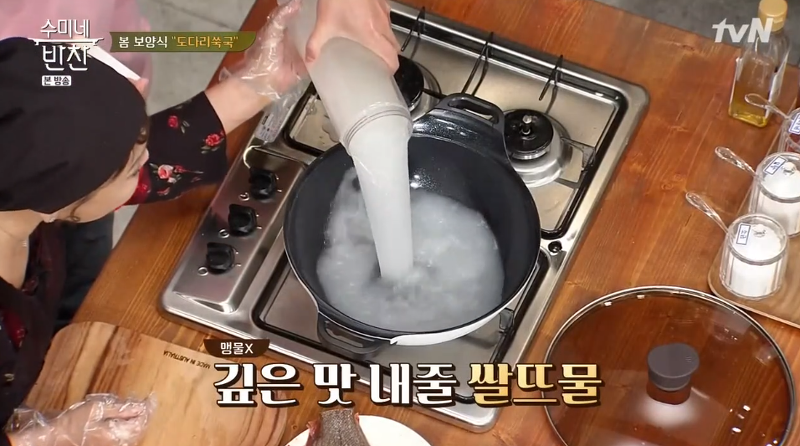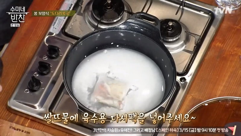 ▶ 쌀뜨물에 육수용 다시팩을 넣어 주세요.