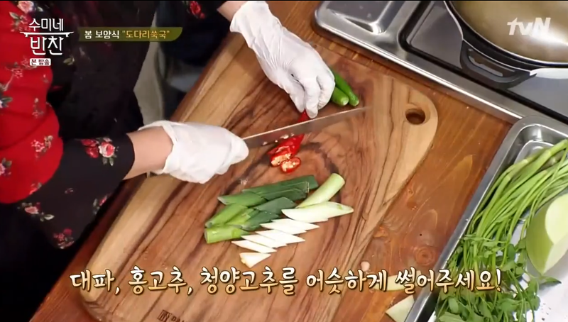 ▶ 대파, 홍고추, 청양고추를 어슷하게 썰어 넣어 주세요.