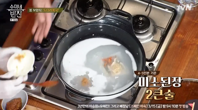 ▶ 미소된장과 재래된장을 각각 2큰술씩 넣어 주세요.