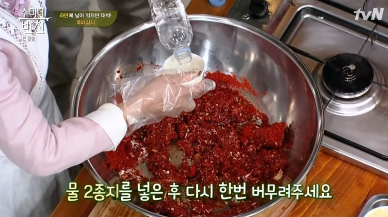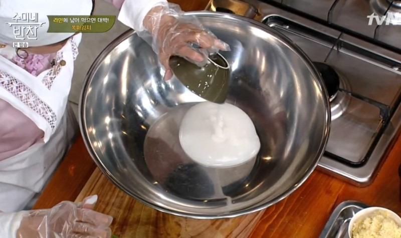 7. 남은 양념장은 물로 씻은 후 김치통에 부으면, 쪽파김치를 맛있게 담그는 법이 완성됩니다.