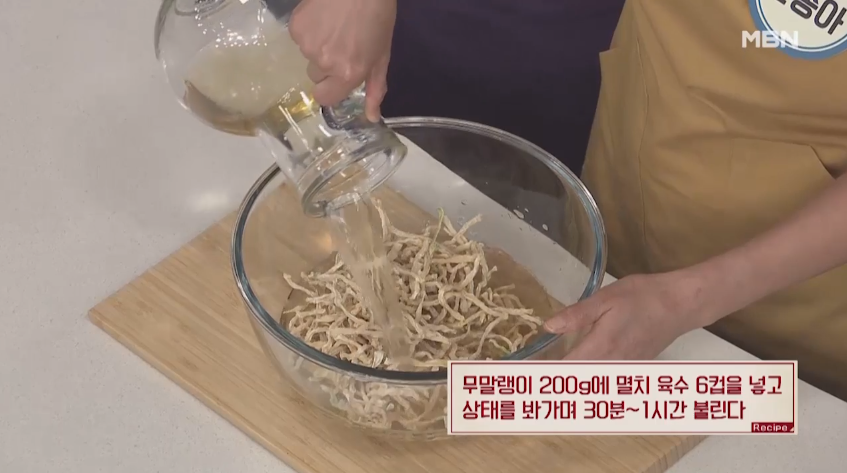 1. 오늘 소개해드릴 쪽파김치 맛있게 담그는 방법은 쪽파를 따로 절이지 않아도 되고, 간이 너무 짜지 않도록 만든 간단한 레시피입니다. 먼저 무말랭이 200g을 준비한 후, 멸치 육수 6컵을 넣고 30분에서 1시간 정도 불려주세요. 상태를 보면서 조절해 주시면 됩니다.