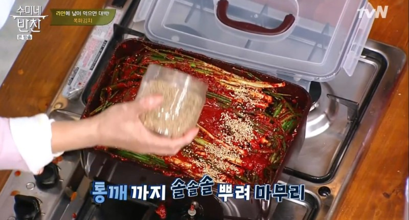 14. 마지막으로 통깨를 적당량 뿌리면, 쪽파김치 맛있게 담그는 법이 완성됩니다.