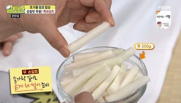 3. 무 200g은 손가락 크기로 굵게 채 썰어 준비해 주세요. 달콤하고 시원한 맛과 함께 아삭한 식감을 더할 수 있습니다.